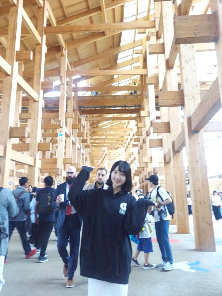 ミス日本みどりの大使の佐塚こころは、万博会場での「木づかいシンポジウム」の司会を務めました。