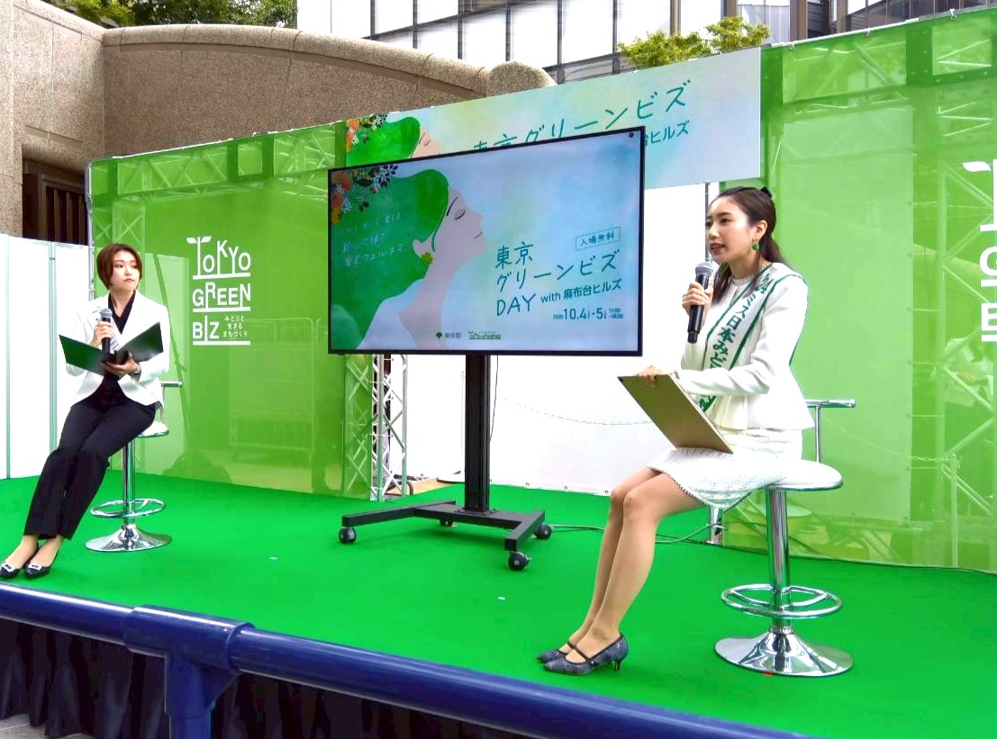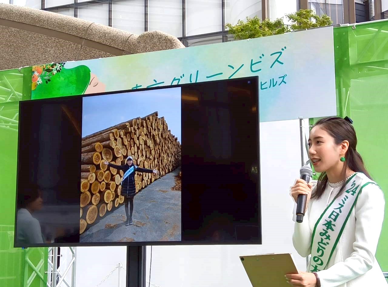 麻布台ヒルズで開催された東京グリーンビズDAYin麻布台のトークショーに2024ミス日本みどりの大使の安藤きらりが登場し、森やみどりの癒やしの力を紹介します。