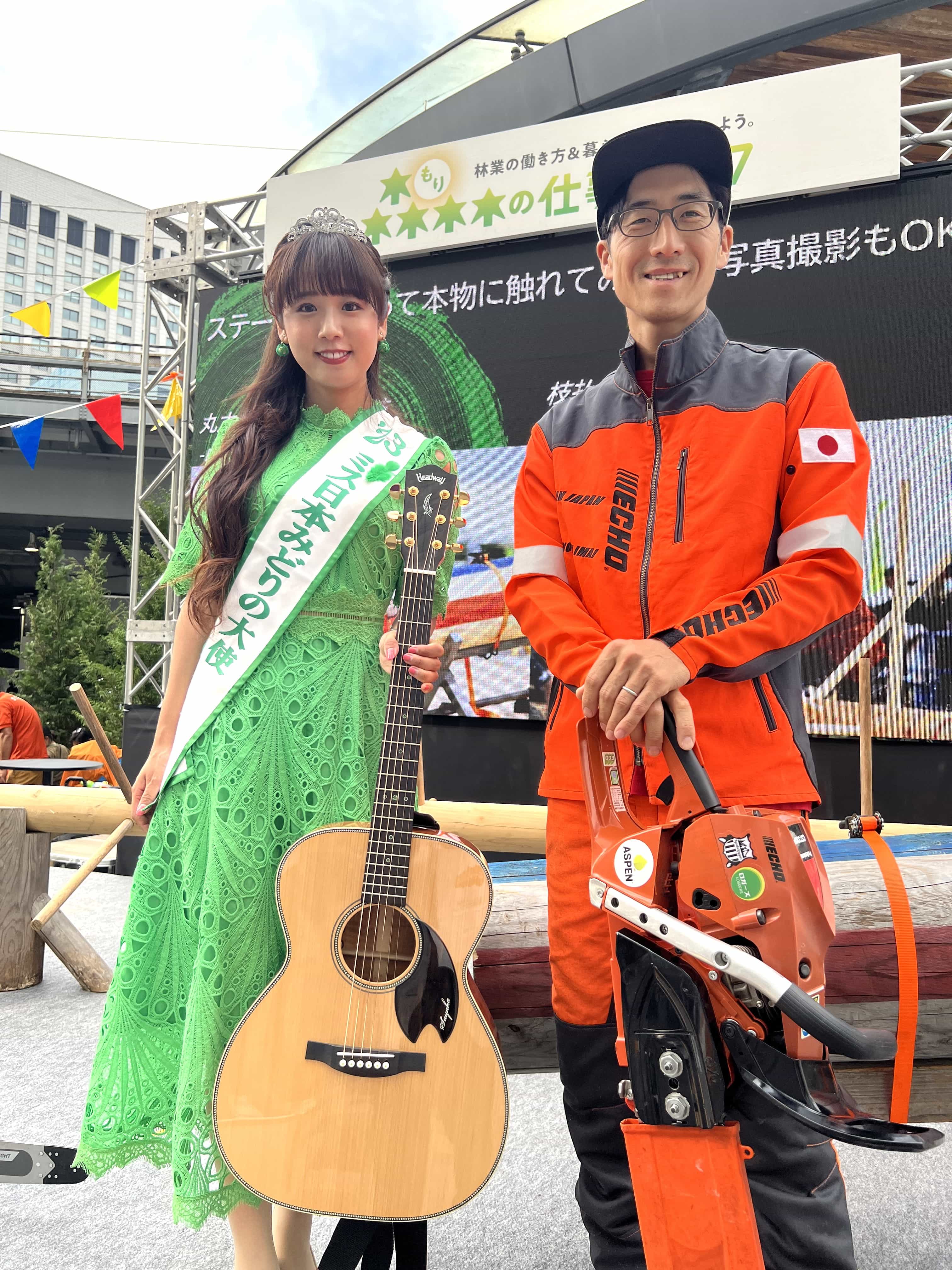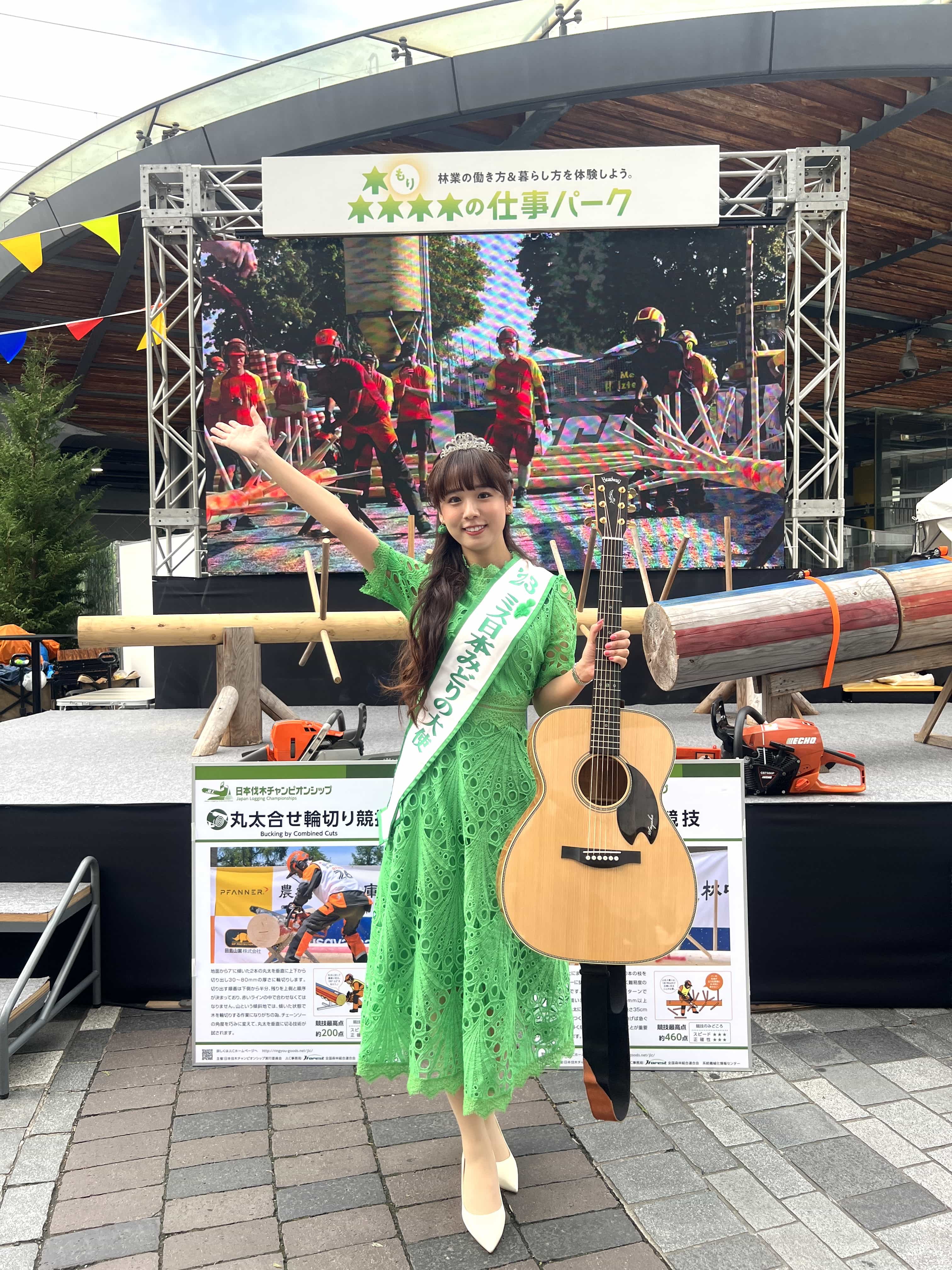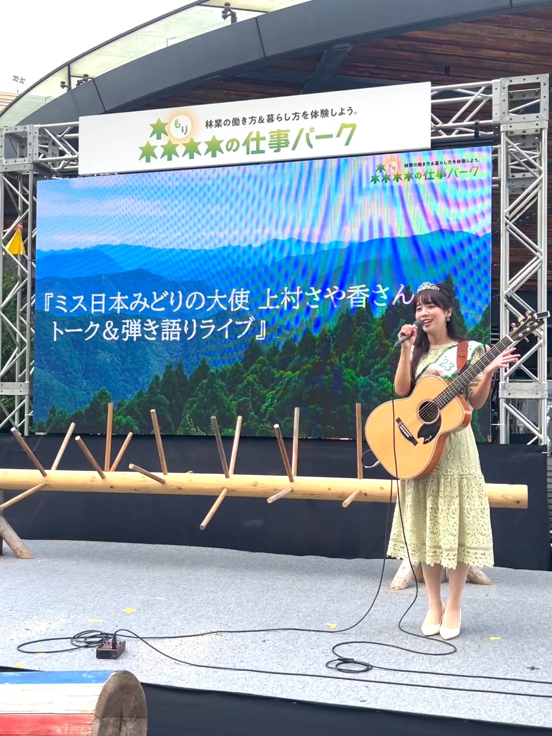 2023ミス日本みどりの大使の上村さや香が、JR有楽町駅前ステージで行われた森林の仕事パークに登場し、弾き語りを披露しました。
