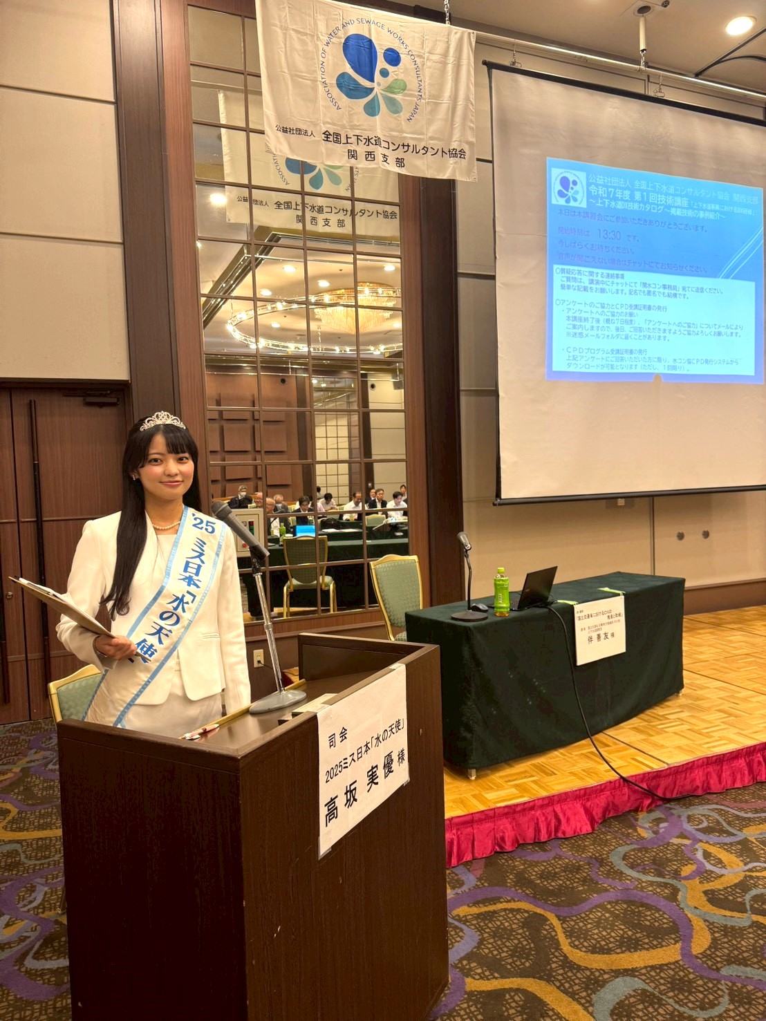 ミス日本「水の天使」の高坂実優が、上下水道企業の勉強会「全国上下水道コンサルタント協会関西支部 技術講座」に司会として登場しました。