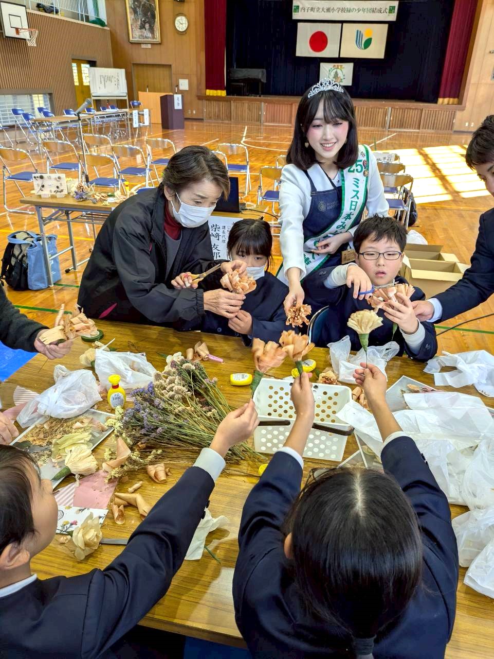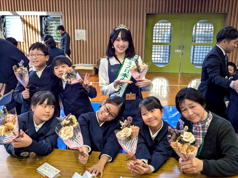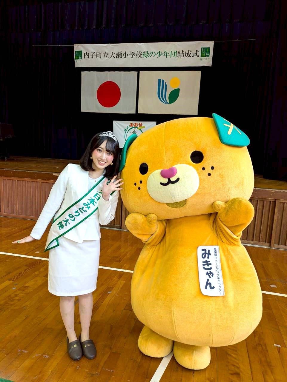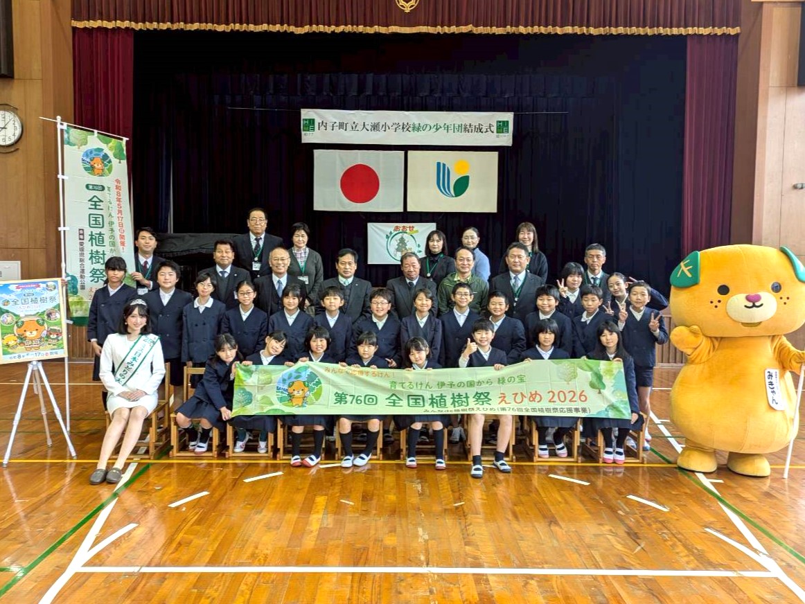 愛媛県の大瀬小学校に新たに緑の少年団が結成されることになり、ミス日本みどりの大使の佐塚こころが式典に出席しました。