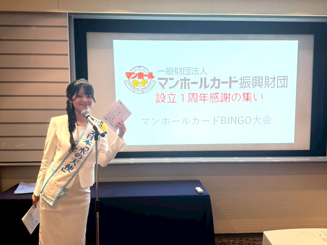 ミス日本「水の天使」の高坂実優が、全国的に普及しているマンホールカードを管理する「マンホールカード振興財団」の1周年記念の式典に司会として登場しました。